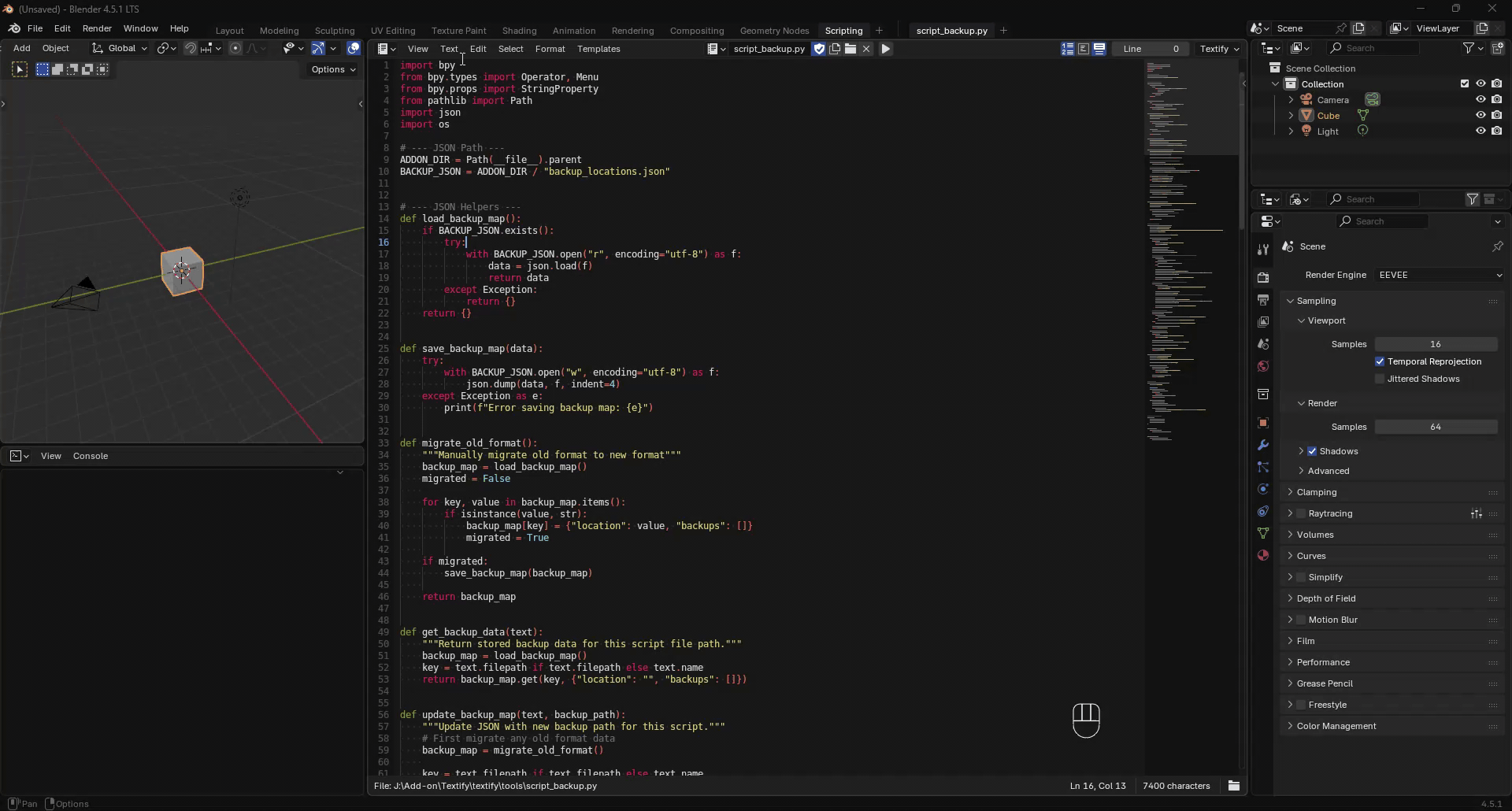 The **Script Backup** tool lets you quickly save backups of your current script in Blender’s Text Editor. You can also view and open previous backups from a dedicated **Backups** menu.